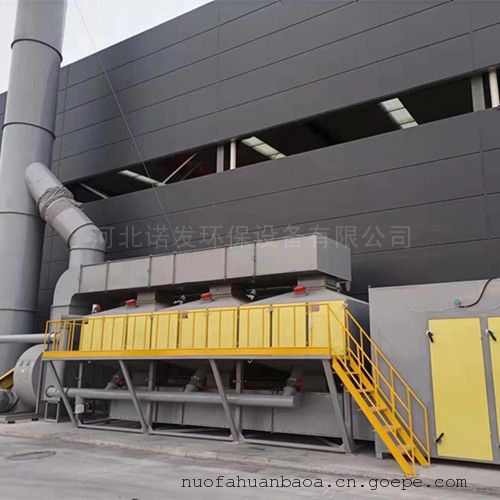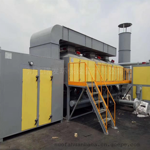 在化学反应过程中,利用催化剂降低燃烧温度,加速有毒有害气体完全氧化的方法,叫做催化燃烧法。由于催化剂的载体是由多孔材料制作的,具有较大的比表面积和合适的孔径,当加热到300~450℃的有机气体通过催化层时,氧和有机气体被吸附在多孔材料表层的催化剂上,增加了氧和有机气体接触碰撞的机会,提高了活性,使有机气体与氧产生剧烈的化学反应而生成CO2和H2O,同时产生热量,从而使得有机气体变成无毒无害气体。 催化燃烧装置主要由热交换器、燃烧室、催化反应器、热回收系统和净化烟气的排放烟囱等部分组成,其净化原理是:未净化气体在进入燃烧室以前,先经过热交换器被预热后送至燃烧室,在燃烧室内达到所要求的反应温度,氧化反应在催化反应器中进行,净化后烟气经热交换器释放出部分热量,再由烟囱排入大气。